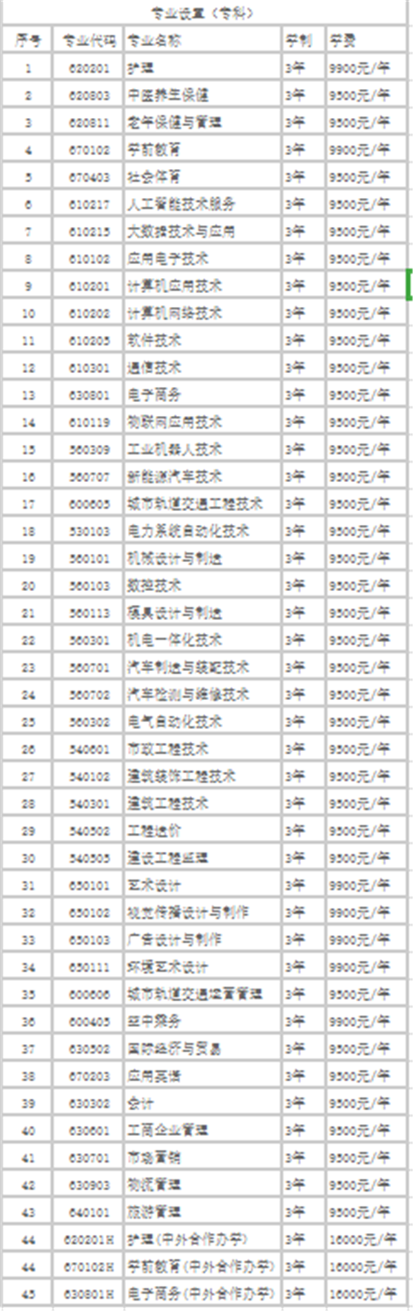 学 费:高职(专科)文理类9500元/学年;艺术类9900元/学年;学前教育、护理、空中乘务专业9900元/学年,中外合作办学专业16000元/学年。