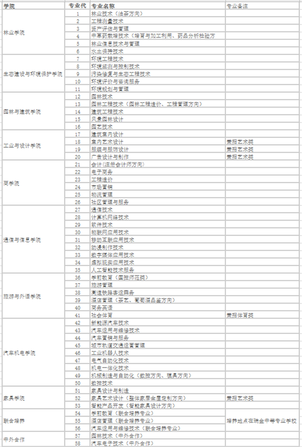 第十条 办学特色:学校秉承立艺树人的校训,坚持以师生为根本,遵循特色办学、开放办学、合作办学的理念,不断深化教育教学改革,提升人才培养质量,是世界技能大赛中国集训基地,是国家生态文明教育基地、国家AAA级旅游景区、全国职业院校魅力校园、全国科普教育基地、“2014年度全国毕业生就业典型经验高校”(简称“全国高校毕业生就业50强”)、全国就业竞争力示范校,是江西省文明单位、江西省“森林校园”、江西省“平安校园”。开设有2个职教本科专业(与南昌工程学院联合办学)、58个高职专业,中央财政支持专业提升产业发展重点项目2个,中央财政支持的实训基地项目4个,省级优势特色专业建设4个,国家林业局重点建设专业2个,省级人才培养创新试验区2个,国家精品课程1门,国家级精品资源共享课程1门,省部级精品课程或精品资源共享课程27门,30余个校企合作“订单班”,实行“定制化”人才培养模式,企业全程参与教学过程,共同培养学生,保障学生定向就业。