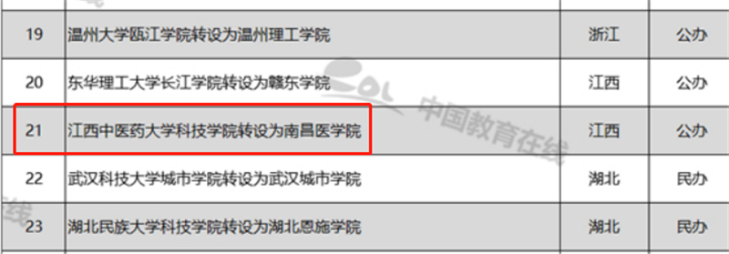 该公示文件显示,根据《高等教育法》《普通高等学校设置暂行条例》《普通本科学校设置暂行规定》和《关于加快推进独立学院转设工作的实施方案》等法律法规政策规定,经第七届全国高等学校设置评议委员会专家考察和评议,并经党组会审议,拟同意中北大学信息商务学院等33所独立学院转设为独立设置的本科学校,其中江西中医药大学科技学院转设为南昌医学院。