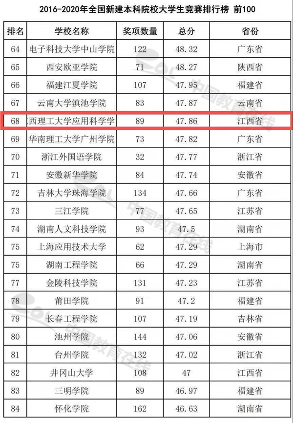 讯 2021年3月22日,中国高等教育学会高校竞赛评估与管理体系研究工作组发布2020全国普通高校大学生竞赛排行榜。江西理工大学应用科学学院位列2016-2020年全国“民办及独立学院”大学生竞赛排行榜第17名,2016-2020年全国新建本科院校大学生竞赛排行榜第68名。这是江西理工大学应用科学学院首次入选该排名。