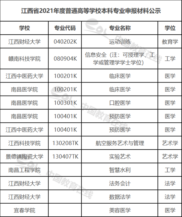 此次公示中,江西省共计8所高校拟新增本科专业13个,具体院校与新增专业如下图:
