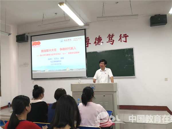 讯 9月9日,刚刚入学报到的九江学院2021级新生迎来了他们的大学第一课。校党委书记赵伟,校长陈小林,副校长王万山、陈春生、杨耀防、夏启国、查振华,纪委书记李广欣,党委委员王殿元、冯健、刘遵海分头走上讲台,围绕学习贯彻习近平总书记“七一”重要讲话精神、做好疫情防控、树立远大理想等内容,为新生讲授了大学第一堂思政课。
