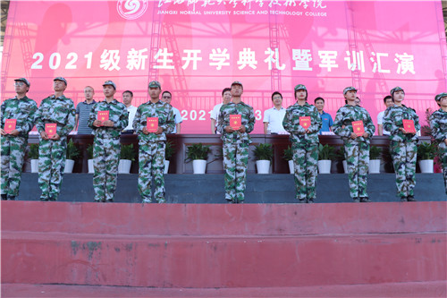 张小桃宣读了江西师大科技学院关于表彰2021级新生军训先进集体和个人的决定,出席典礼的领导、嘉宾为军训先进集体、个人代表颁奖。
