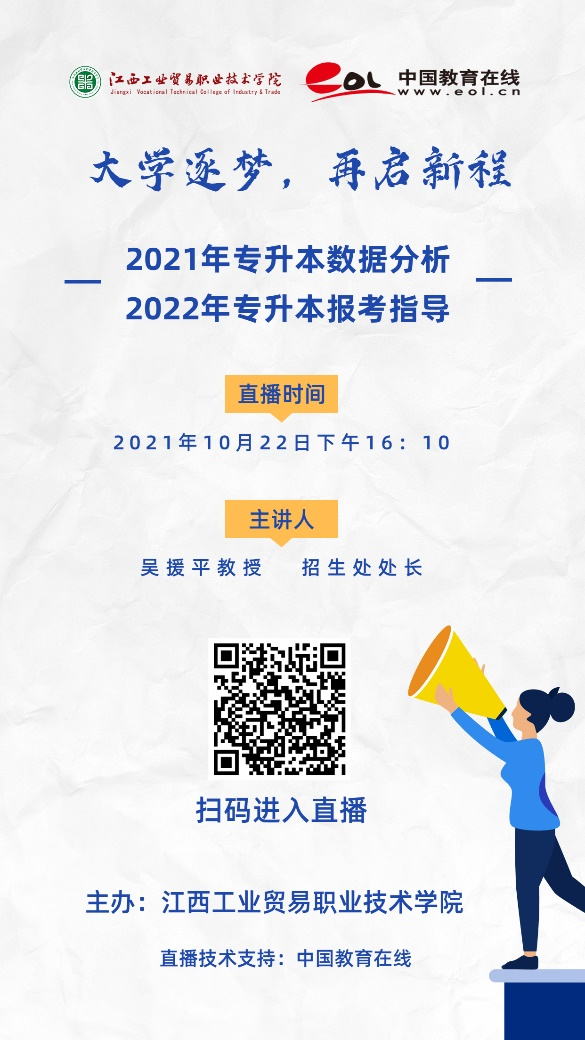 为帮助大家准确、全面地了解202022年专升本报考指导,10月22日下午16 : 10,联合江西工业贸易职业技术学院将开展“2021年专升本数据分析“及”2022年专升本报考指导”线上直播,为各位考生及家长分享,一定不要错过!