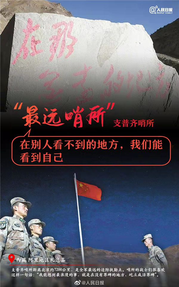 平旭所在的支普齐边防哨所屹立于海拔4300多米的群山之中,距离北京7200多公里,是全军距离首都北京最远的边防执勤点。哨所的战士很喜欢这样一句话:“我能想到最浪漫的事,就是在没有界碑的地方,屹立成活界碑。”平旭所在部队是支英雄的部队,守卫在中印边境线上,紧握钢枪,为祖国站岗。在那里站岗,手握着钢枪,没有思乡的泪水,只有刚毅的眼神扫射四方;没有疲惫的身影,只有挺拔的身姿天地徜徉;没有退缩的念想,只有无悔的誓言守卫边关的和谐与安宁。