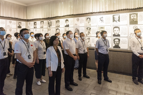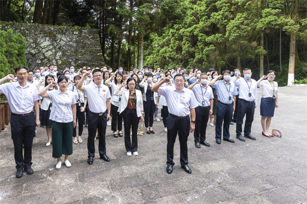 在革命烈士陵园脚下,大家现场学习了革命先烈刘仁堪的事迹。刘仁堪坚贞不屈,英勇就义,临行前用脚蘸鲜血书写就“革命成功万岁”的英雄形象,让大家不禁动容。踏过层层台阶,追忆百年历程,大家在大厅瞻仰革命烈士,为烈士敬献花篮,在一场“跨越时空的会面”中感悟革命先烈坚定理想信念、勇于牺牲的崇高品质。随即,一行人聆听了革命先烈的事迹。王次淳、伍若兰、张宗逊、赖传珠......一个个名字、一张张照片、一段段介绍,都刻录着永世不朽的英雄人生。石碑无声,烈士无言,却无处不在述说那段峥嵘岁月。面对党旗,党委书记赵恒伯领誓,全体党员重温入党誓词,再一次向党做出庄严承诺,赓续红色精神,在新征程上砥砺奋进的荣誉感、责任感和使命感油然而生!
