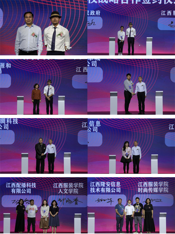 开幕式上,江西服装学院分别与石城县人民政府、吴江高新区(盛泽镇)人民政府、安阳中原高新技术产业开发区管委会、射阳县人力资源和社会保障局、浙江凌迪数字科技有限公司、海宁中国皮革城股份有限公司、苏州上久楷丝绸科技文化有限公司、广州市丹昱信息科技有限公司、江西配播科技有限公司、江西省众灿互动科技股份有限公司、江西隆安信息技术有限公司、江西半橙科技有限公司进行了政校、校企、院企合作签约仪式。
