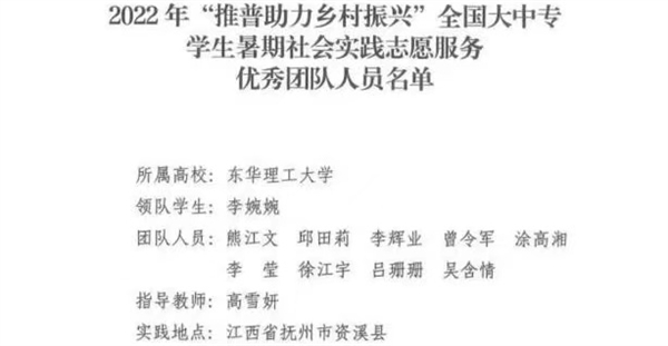 喜报!东华理工大学推普团队获评“推普助力乡村振兴”全国大中专学生社会实践志愿服务优秀团队