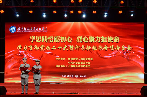 3月18日,赣南师范大学科技学院在田径场举行“学思践悟砺初心,凝心聚力担使命”学习贯彻党的二十大精神长征组歌合唱音乐会。音乐会由赣南师范大学科技学院和中共于都县委宣传部联合主办,于都县长征源合唱团倾情献演。赣南师范大学科技学院党委书记肖笃森、院长朱钦胜等党政领导班子,于都县人民政府党组成员、中央红军长征集结出发历史博物馆馆长谢芸华出席,2000余名师生到场观看演出。