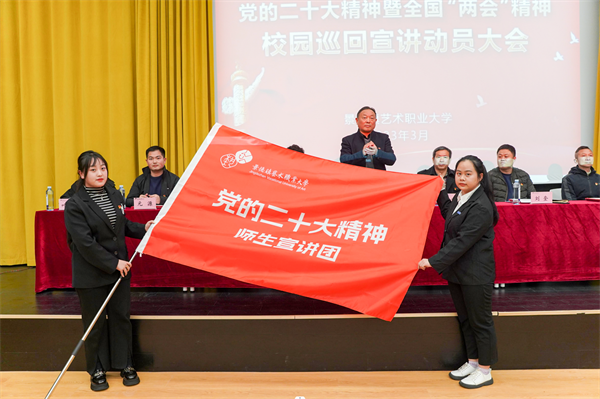 为持续深入学习贯彻党的二十大精神和全国“两会”精神,3月20日,景德镇艺术职业大学召开学习贯彻党的二十大精神暨全国“两会”精神校园巡回宣讲动员大会,对全校师生开展全覆盖宣讲。师生宣讲团全体成员、各学院300余名学生代表参加会议。