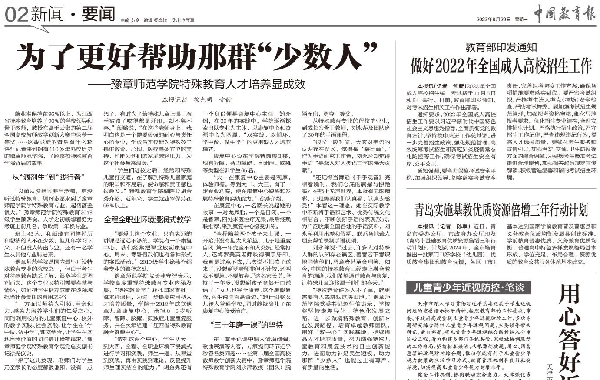学院发挥党员教师的主动性和创造性,秉持学生发展为中心理念,构建了“双实践、双循环,学中做、做中学”的应用型人才培养模式,通过“全学程、浸润式”实践教学,推动党建和人才培养工作相融相促落地见效。“依托这两个中心,学生从大一到大四,全程、全职业环境下浸润式进行学习和实践,师生一道,从课堂到实践,再由实践到理论,反复提升师生理实结合的能力。”学院副院长胡金秀说,“学生们进校之后,经常和特殊儿童打交道,在了解特殊儿童家庭的艰辛和不易后,使命感和责任感也被激发出来。”近年来,学院学生就业率保持在96%以上。2022年,中国教育报以《为了更好帮助那群‘少数人’——豫章师范学院特殊教育人才培养显成效》为题,在要闻版进行了大篇幅报道。
