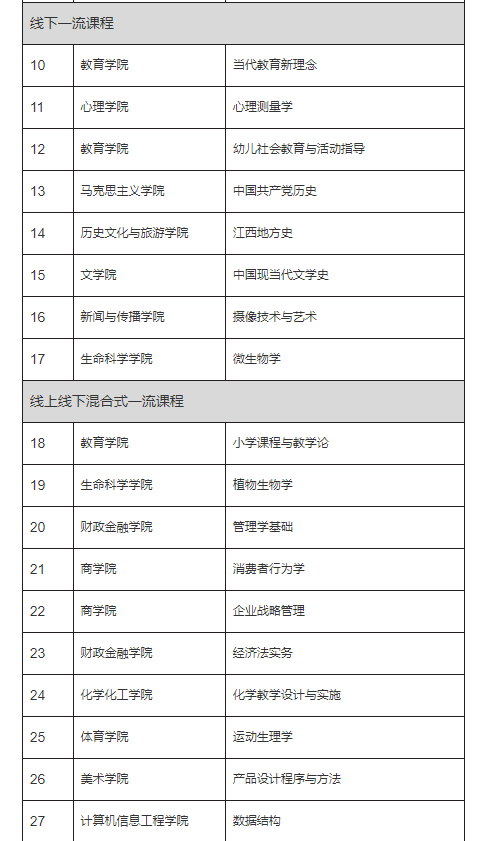 答:学校现有国家级一流本科课程32 门,其中线上一流课程5 门,虚拟仿真实验教学一流课程4 门,线下一流课程8 门,线上线下混合式一流课程10 门,社会实践一流课程5 门;省级一流课程201 门。