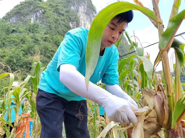 这次实践团所在的古棠村属于喀斯特地貌大石区,立足本土自然优势,古棠村全面推广玉米标准化种植,队员们在村支书的号召下前往玉米地帮助当地村民收割玉米。采摘现场,队员们交流玉米地丰收探索玉米产业融合发展新模式,干劲十足,掰玉米、装袋、搬运......大家分享着收割玉米的经验和技巧,默契协作,玉米地里不时迸发出一阵阵爽朗笑语,一道道弯身入田的身影形成乡村田间靓丽的风景线。