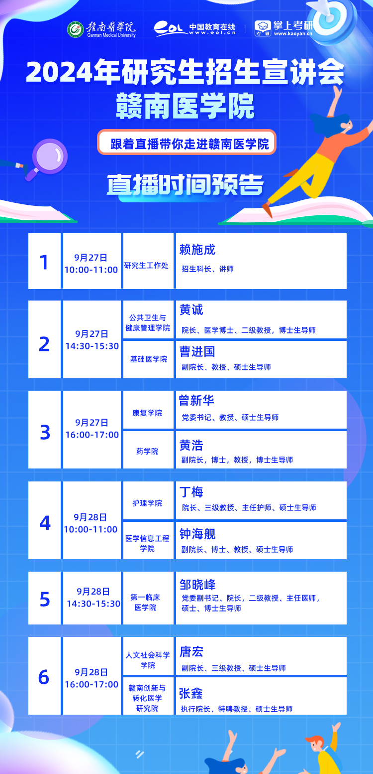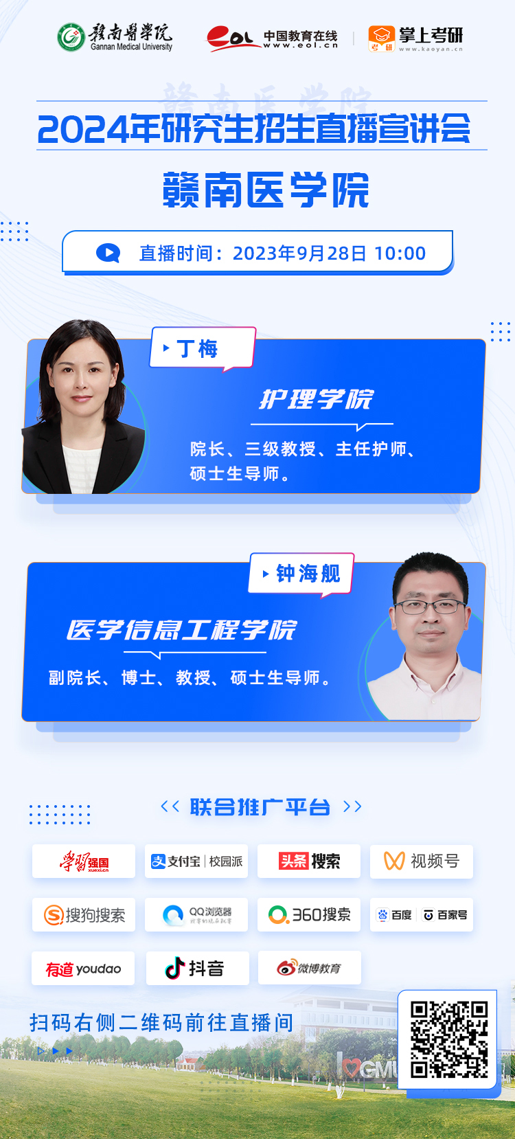 为帮助广大考生详细了解赣南医学院的研究生招生政策,得心应手地进行备考。赣南医学院联合·掌上考研,将于9月27日-28日在线举办6场研究生招生直播宣讲会。本次直播邀请到研究生工作处,以及第一临床医学院、公共卫生与健康管理学院、基础医学院等9个学院。各学院齐聚云端,带你解读最新的研招政策,在线互动,答疑解惑,敬请关注!