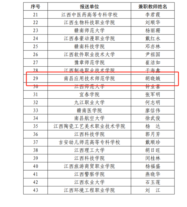 近日,省教育厅公布全省高校思政课优秀特聘教授、优秀兼职教师评选结果,经全省各高校推荐申报、专家评审、结果公示等环节,南昌应用技术师范学院党委书记、督导专员胡晓娥被评选为“江西省高校思政课优秀兼职教师”。