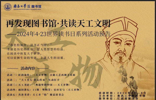2024年4月23日,第29个世界读书日之际,南昌工学院图书馆开展“再发现图书馆·共读天工文明”2024年4·23世界读书日系列活动,以响应中国图书馆学会《关于开展2024年全民阅读工作的通知》号召。活动围绕“再发现图书馆·共读天工文明”主题,通过一系列阅读推广活动,服务多元阅读需求,推广优质阅读资源,为推动中华优秀传统文化创造性转化和创新性发展作出切实贡献。