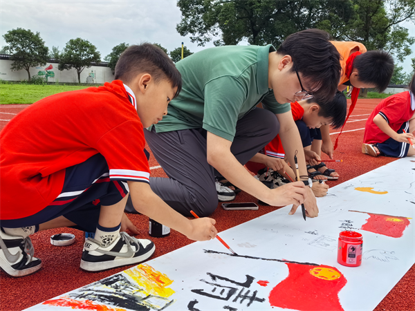 蓝天白云下,小小画家们在画卷上以画传情、以画抒志。时间在笔尖悄然流淌,学生们将自己对党的感恩之情、对祖国的美好期待都变成一个个鲜活的场景,在画卷上一一呈现。尽管大汗淋漓,孩童们仍专注创作,绘绘彩彩,每一划都饱含温情,携手共绘,七十一米长卷交织着希望与梦想。实践队员们与儿童,以笔为媒,心手相连,在画布上勾勒出未来,让对祖国的爱意在色彩间流淌。一笔一画中,寄托着卢德铭小学的孩童对共产党诞生的敬仰之情。他们怀着百分之一百的热情,用最朴素的画笔,绘出自己心中的党。