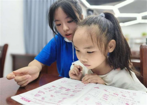 图为实践团成员陈珺为孩子课后辅导作业。计心怡供图。