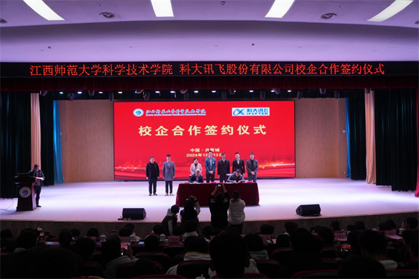 12月13日下午,江西师范大学科技学院与科大讯飞股份有限公司校企合作签约仪式在梦剧场举行。共青城市委常委、副市长胡胃东,科大讯飞股份有限公司副总裁孟庆勇,江西讯飞总经理查伟旭,共青城青讯执行总经理王景尖;江西师范大学科技学院院长宁洁、党委书记肖接增、副院长陈志丹,党委委员余小军、詹焰明出席仪式。校企双方有关部门负责人、师生代表等800余人参加。仪式由肖接增主持。