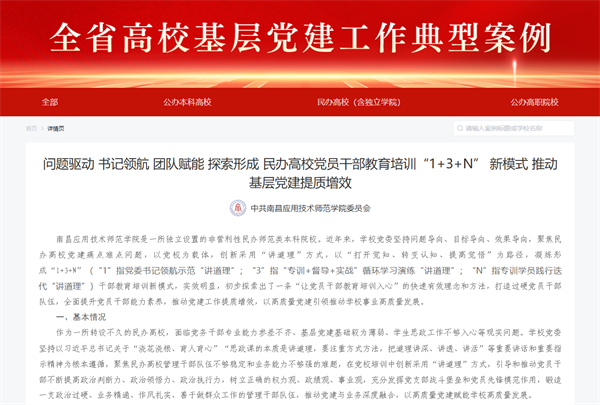 近日,全省高校基层党建工作典型案例评选结果公布,南昌应用技术师范学院党委书记、督导专员胡晓娥主持推动的《问题驱动·书记领航·团队赋能——探索形成民办高校党员干部教育培训“1+3+N”新模式》成功入选,并作为示范案例在赣鄱党建云平台专题轮播展示。该案例基于“党委书记讲道理”党建思政项目成功经验,由胡晓娥带领“书记讲道理”专训班全体学员历时两年创新实践而来,初步探索出了一条“让党员干部培训入心”的快速有效理念和方法。