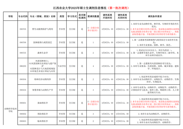 1.学校发布调剂公告。学校在研究生招生网(https://yzb.jxau.edu.cn/)公布调剂专业、调剂名额、调剂条件、调剂程序及联系方式等,并在教育部调剂系统设置调剂专业、名额及调剂要求条件。