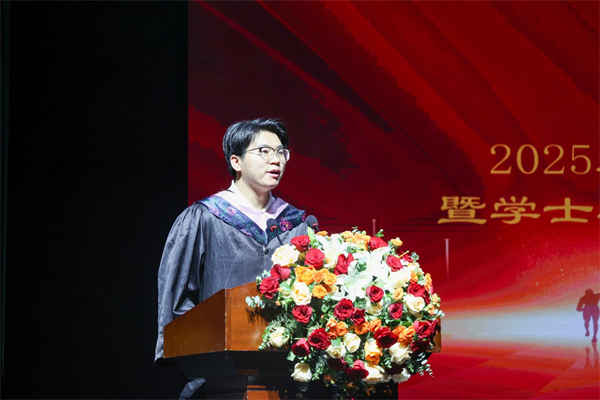 校长陶也青以《以诗为舟,载梦启航》为题,为2186名毕业生送上深情寄语。他回顾了学子们在校期间,参加考研、考公、各类竞赛与社会实践等奋斗历程,赞扬大家以“宝剑锋从磨砺出”的精神书写青春篇章,更愿“宝剑梅花”永驻同学们心间,继续照亮前行的路;他以“纸上得来终觉浅,绝知此事要躬行”的谆谆教诲,勉励毕业生秉持“德技兼备、知行合一”校训,在实践中探索真知,以双手丈量知识的深度,以汗水浇灌智慧的秧苗,希望大家永葆“躬行”热忱,让知行合一贯彻一生;面对人生新旅程,他希望同学们以“长风破浪会有时,直挂云帆济沧海”的气概,乐观坚韧地迎接挑战,于基层沃土扎根生长,永葆赤子之心,怀揣勇敢热忱,眼中有光,脚下有路,未来必可期;激励毕业生怀揣梦想,勇敢启航,在新时代肩负使命,绽放光彩。同时表示,应师院愿意成为同学们永久的精神家园,永远在家的方向,等风也等你!