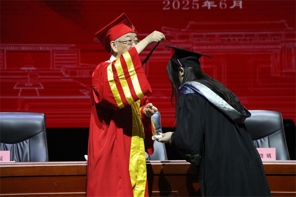 毕业生们相互整理毕业帽、流苏等待校长行拨穗之礼。伴随着激昂振奋的音乐,陶也青为毕业生逐一拨穗授位,并合影留念。(来源:南昌应用技术师范学院)
