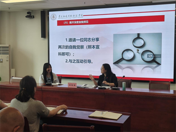 讲座中,胡晓娥两次以“运用13块从拇指盖大小到100磅重的多米诺骨牌连锁推倒”视频为镜,穿插机关部门作风能力建设“一对一”访谈和调研问卷报告剖析展示,以及对一则信访案例解析,精心设计“觉察自我”“照见自我”“提升自我”三次进阶式互动环节。从真实记录“第一直觉触动”的朴素表达,到聚焦“机关职能部门在学校管理体系中的地位与价值”“对‘身在兵位,胸为帅谋’的切身感悟”的深度链接,引导党员干部在思维碰撞中审视机关作风建设的深层内涵,对照检视,反思日常工作中存在的作风问题。