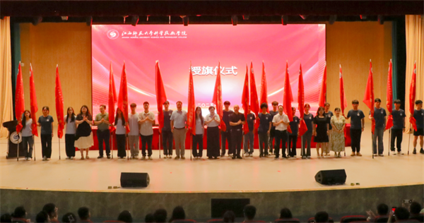 在激昂的乐曲声中,鄢俊彬、宁洁等依次为15支社会实践队授旗。鲜艳的旗帜在队员们手中挥舞,传递着责任与使命,现场气氛热烈而庄重。