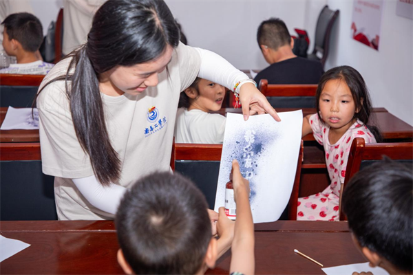 图为队员兰婧带小朋友做科学实验。齐志鹏摄