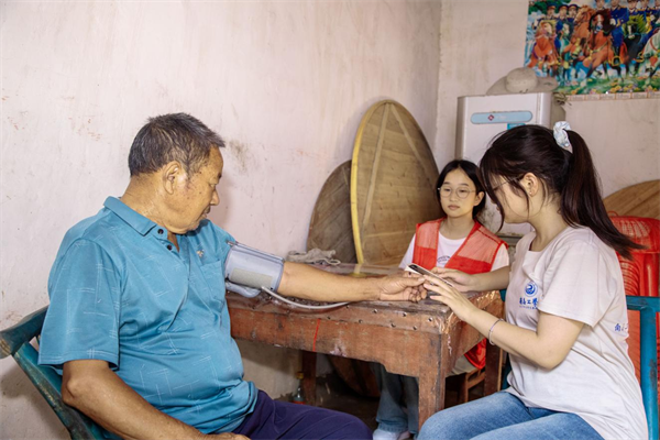 图为队员洪娱为留守老人测血压。齐志鹏摄