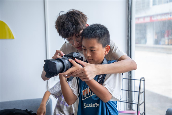 图为队员林晨瑜教授小朋友相机摄影。齐志鹏摄
