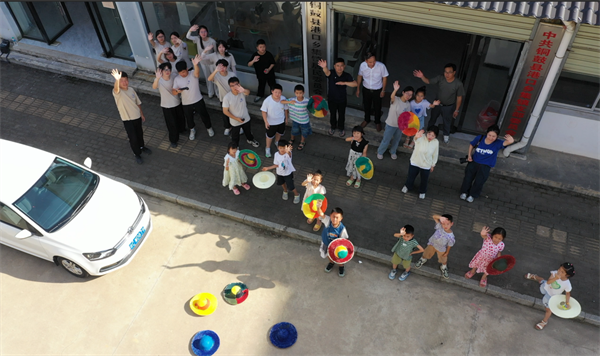 图为队员们和孩子们向无人机挥手。齐志鹏摄