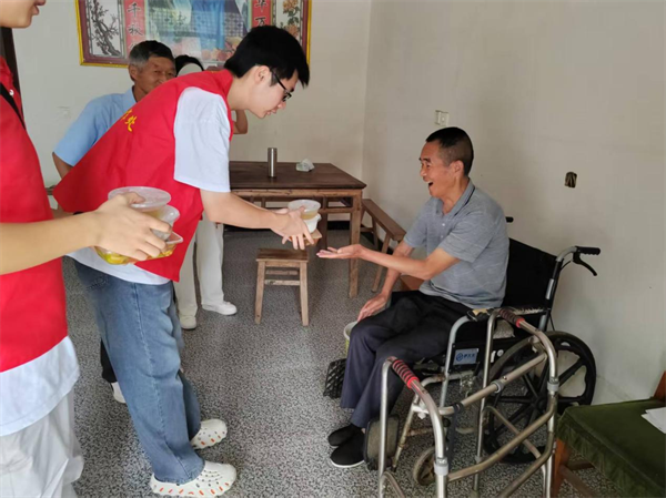 实践队深入金兰村贫困老人家中,心理专职教师带领队员针对老人身体状况、家庭结构设计心理帮扶策略:陪伴八旬失明老人夫妇唠家常,疏导91岁赵奶奶的孤独情绪,以专业知识为老人送去慰藉。队员们不仅为行动不便的老人送去热腾腾的爱心餐食,还与老人们围坐聊天,倾听他们的人生故事,一饭一蔬传递生活关怀,一言一语倾注精神慰藉,让尊老美德在乡村实践中绽放出温暖而动人的光彩。