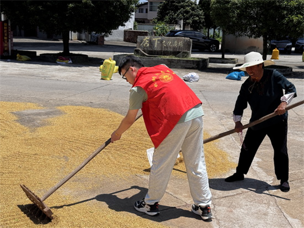 7月3日正午,气温飙至40℃。队员主动协助农户晾晒新收稻谷,队员燕远东的衣衫浸透了汗水。“晒1小时稻谷喝光3瓶水,农民却年复一年坚守”,队员在日记里写道。通过亲身实践,队员们深化对国家粮食安全战略的认知,筑牢“把饭碗端在自己手里”的青年使命。