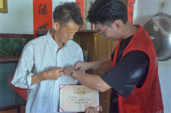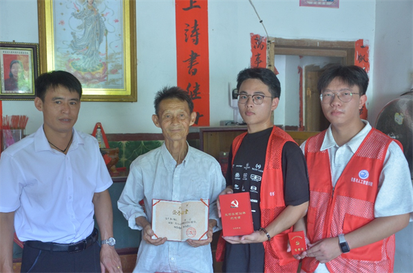在上门拍摄过程中,实践队员们有幸拜访了两位为人民奉献一生的老党员——凌玉如老干部和凌兴权老支书。队员们走进凌兴权老支书家中,和老支书促膝长谈。老支书满怀自豪地拿出“光荣在党50年”纪念章和模范党支部书记荣誉证书,向青年们分享他的峥嵘岁月与毕生信念。“要听党话、跟党走,做社会主义事业的接班人!”,老支书紧握队员的手,郑重嘱托,将红色信仰的接力棒传递到年轻一代手中。