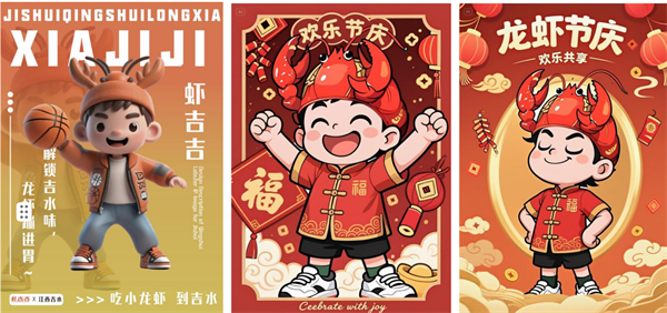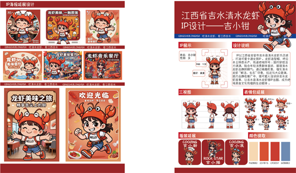 实践队员们充分运用专业知识技能设计了清水龙虾特色IP形象。其融合了吉水清水龙虾的特点以及当地的文化元素,既有着可爱俏皮的外形,也蕴含着吉水独特的地域文化内涵。其具备极高的辨识度和传播性,有效助力清水龙虾进一步提升其品牌影响力。