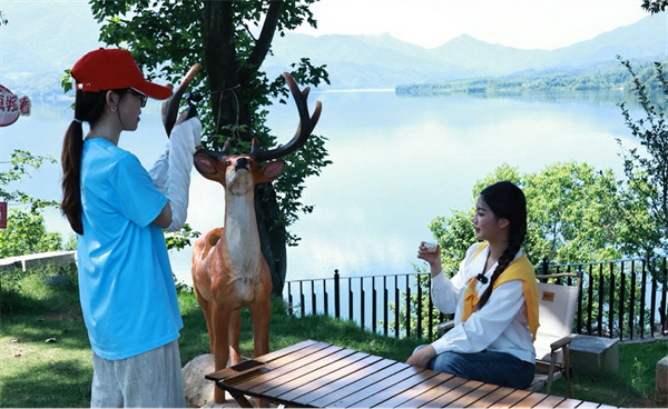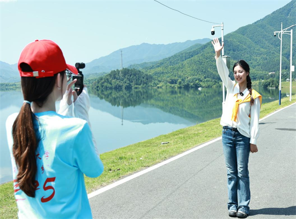 随着无人机缓缓升空,一幅壮美的山水画卷在镜头中徐徐展开,群山环抱的湖面如同一颗湛蓝的宝石,在阳光下闪烁着迷人光彩。队员们充分发挥播音主持、戏剧影视专业特长,精心规划拍摄路线,围绕“湖光山色、古樟树林、日落茶韵”三大主题进行创作。拍摄过程中,队员们巧妙捕捉垂柳拂水、碧波荡漾的灵动画面,生动展现出梦湖的清幽之美。在体验环节,队员们冲泡当地的富硒有机茶,将茶香四溢的独特韵味融入镜头,让人文风情与自然风光相得益彰。