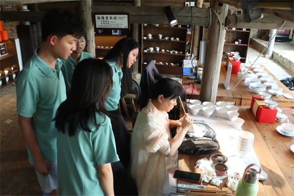 徐家窑是目前景德镇保留最完整、最古老、最大的柴窑遗址,同时也是世界上现存最大的柴窑。徐家窑于明末始建,2013年以“明清窑作群遗址”的身份被列入国家陶瓷非遗保护项目。在徐家窑,队员们系统学习了传统制瓷全流程,从选矿、粉碎、淘洗、练泥到拉坯、利坯、施釉、装烧的复杂工序,完整呈现古人造物智慧的传承脉络。现场观摩陶瓷艺人制瓷与彩绘过程中,艺人指尖的泥土在轮盘旋转中渐次成形,画笔于素坯之上勾勒出兼具古韵与雅致的纹样,展现出精湛的技艺功底。交流中,艺人分享了从业历程及对传统技艺传承的思考,其“虽后继者寡,然传艺之心不渝”的坚守,彰显出非遗传承人的责任担当。