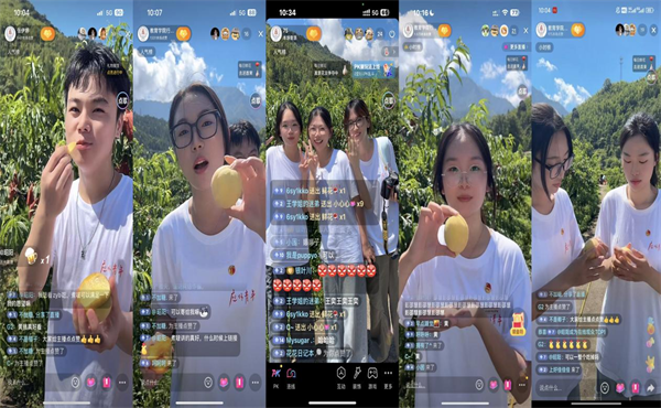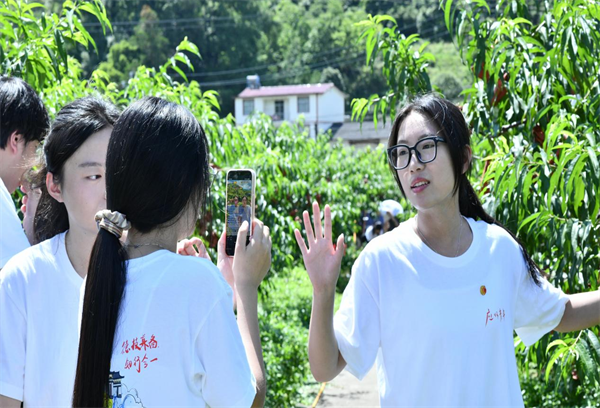 图为实践队成员在井冈山黄桃种植基地“直播带货”。眭娜摄