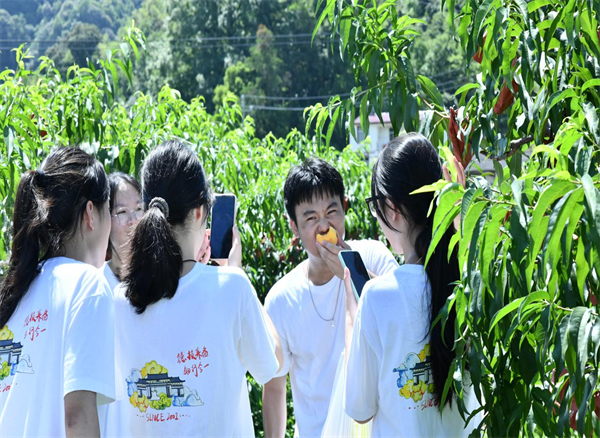 图为实践队成员与井冈山黄桃种植基地负责人交流。欧阳连花摄