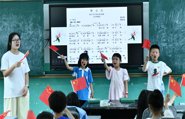 图为实践队成员在实验小学开展红歌传唱活动。欧阳连花摄