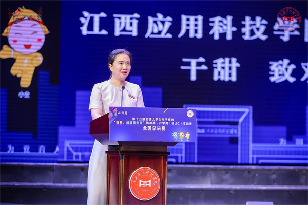 干甜代表承办校致辞。她介绍了江西应用科技学院在应用型人才培养方面的办学定位与实践成果。她指出,本届总决赛在人工智能推动产业变革的背景下,为青年学子提供了将专业知识与商业实践相结合的广阔平台,也为学校与企业、高校与学生之间的深入交流搭建了桥梁。她表示,学校将以此次赛事为契机,持续推动“高校—企业—创客”协同机制建设,积极探索企业命题、高校支撑、学生参与的实践教学路径,推动产教融合走深走实。
