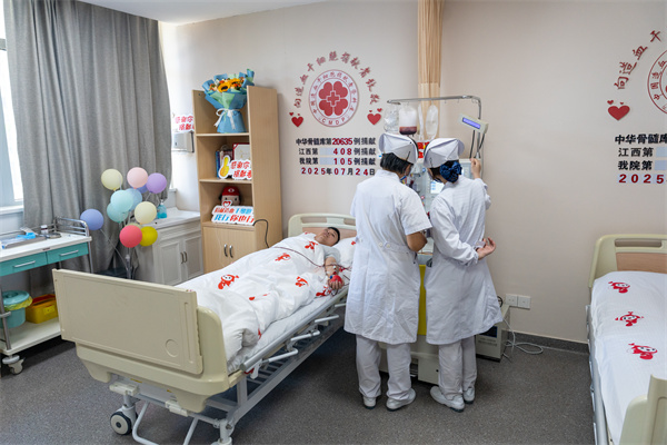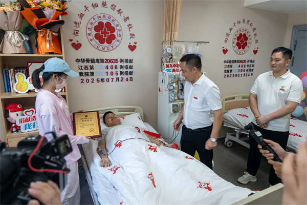 7月24日,在江西省人民医院的造血干细胞采集室,朱益翔安静地躺在病床上。血液分离机缓缓运行,他正为远方一位素不相识的白血病患儿捐献“生命的种子”——造血干细胞。整个过程,他的脸上带着平和的笑容,这份笑容背后,是他对一份承诺的坚定履行。