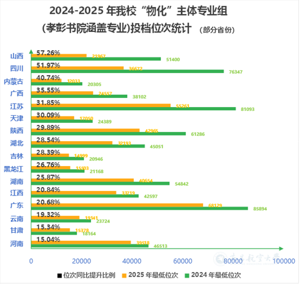 与此同时,南昌航空大学在省外的招生同样呈现强劲的增长态势。如在四川省的“物化”102组投档线达581分,最低录取位次为36672位,同比提升51.97%;在山西省“物化”303组投档线达567分,最低录取位次为21967位,同比提升57.26%;在内蒙古自治区“物化”002组投档线达569分,最低录取位次为12003位,同比提升40.74%。此外,南昌航空大学在江苏、陕西、湖南、湖北、黑龙江、天津、吉林、广西等省(区、市)的录取最低位次同比提升率均超过25%,在广东、云南、甘肃、河南等省份均超过15%。