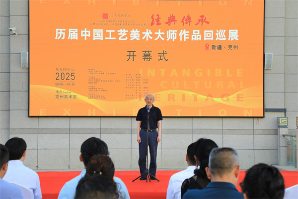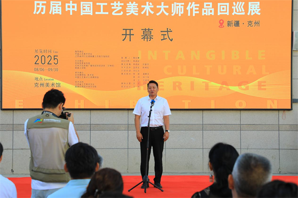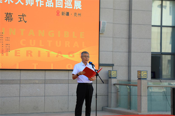克州党委常委、宣传部部长艾祖鹏宣布“经典传承——历届中国工艺美术大师作品回巡展”新疆克州站开幕。
