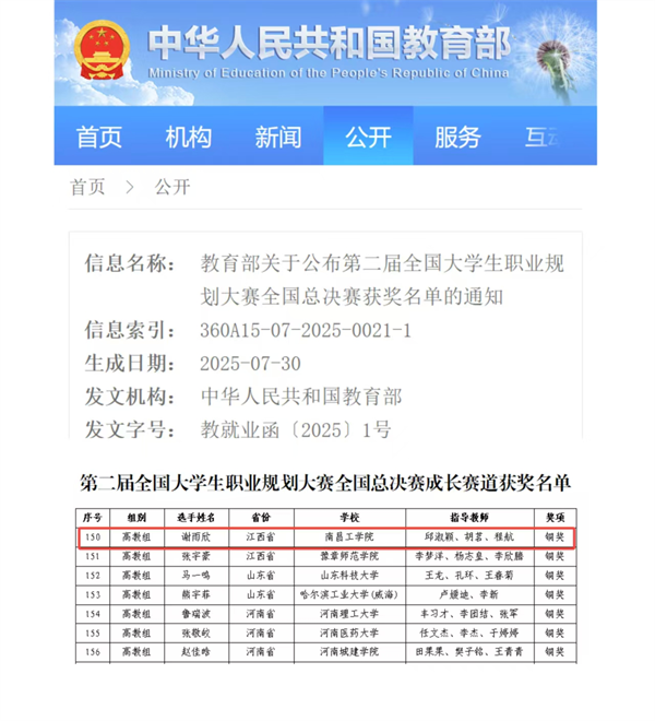 近日,教育部公布第二届全国大学生职业规划大赛总决赛获奖名单。南昌工学院教育学院2022级小学教育专业学生谢雨欣凭借“赣鄱教育守望者”作品,荣获成长赛道高教组铜奖。
