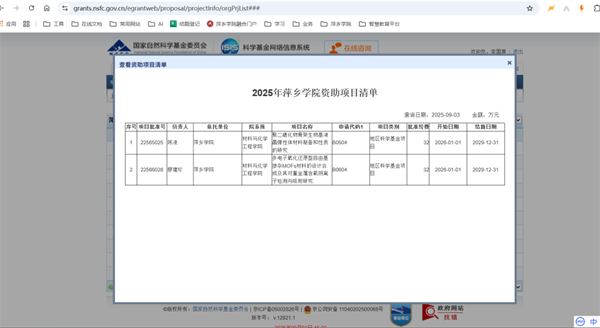 近日,国家自然科学基金委员会正式公布了2025年度国家自然科学基金项目立项结果。萍乡学院再传捷报,共有2个项目成功斩获国家自然科学基金地区基金立项资助,直接经费合计64万元。