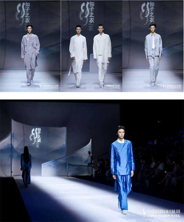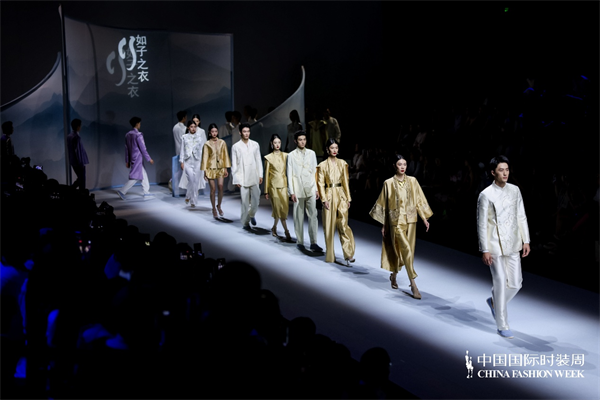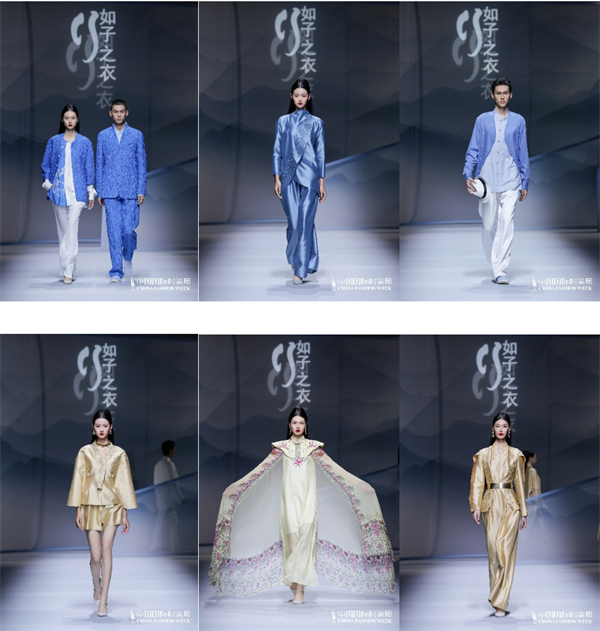 “如子之衣”品牌主理人、江西服装学院教授闵悦以“愿”为主题,创造了一场文化与时尚的完美交融。整场大秀层次分明,以“天愿”“地愿”“人愿”为三大视觉章节,以新中式高级服装定制理念为核心,抒发对传统文化的尊崇与敬畏,并以此为驱动力的召唤,激发当代消费者对探索传承的审美认知。“天愿”的老真丝、丝毛混纺等矜贵面料,“地愿”的丝麻、柞蚕丝、棉麻以及提花香云纱,“人愿”的天丝麻、再生尼龙、人造丝等环保科技面料,在与汉代陶器与织锦中的曲线纹样充分融合后,被转化为具有现代感的印花与镂空刺绣,既承接传统服饰的“骨架”结构,也吸纳当代审美的节奏,更以未来时空的变幻为服饰发展锚定守恒方向。