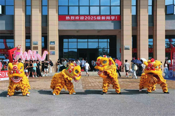 各教学院为迎新准备了精彩节目。舞龙舞狮热闹开场,锣鼓声中,金光闪闪的长龙追逐宝珠,穿梭腾跃;威武的雄狮翻滚跳跃,动作行云流水、刚劲有力,瞬间点燃全场气氛。动人的旋律回荡在空中,师生和家属围拢欣赏,掌声与欢呼不绝于耳。各教学院特色打卡区前人流如织,一个个家庭笑容满面,以镜头定格温馨时光;更有新生按下电子屏按钮,骄傲地点亮“我是第N位科院新上人!”欢笑声、掌声、乐声与绚烂色彩交织在一起,构成一幅生动热烈的开学画卷。